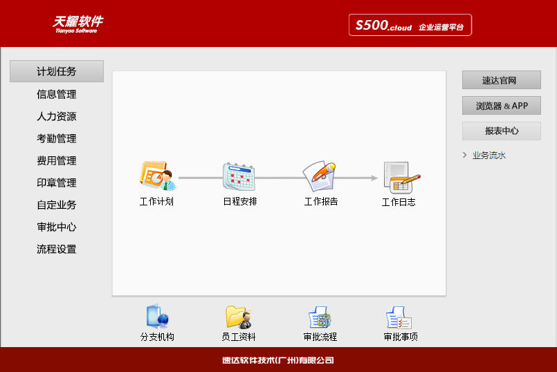 部门、职位、员工、权限、地区、客户、商品、费用项目、审批流程、企业信息、全局账号管理 |